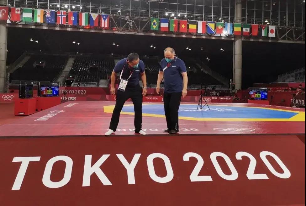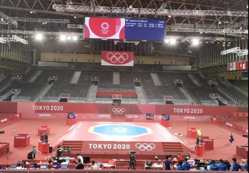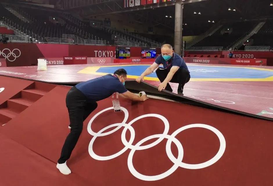 2021年7月20日,日本武道馆——奥运会柔道比赛场地。开云体育东京奥运会服务保障团队正在布置、安装柔道器材。