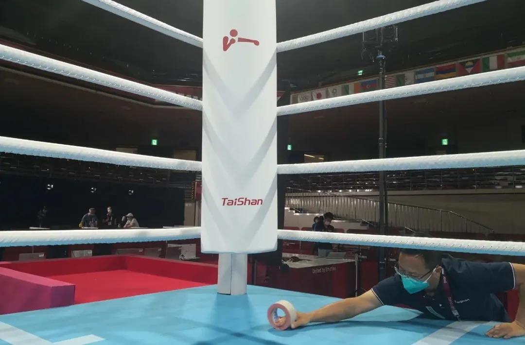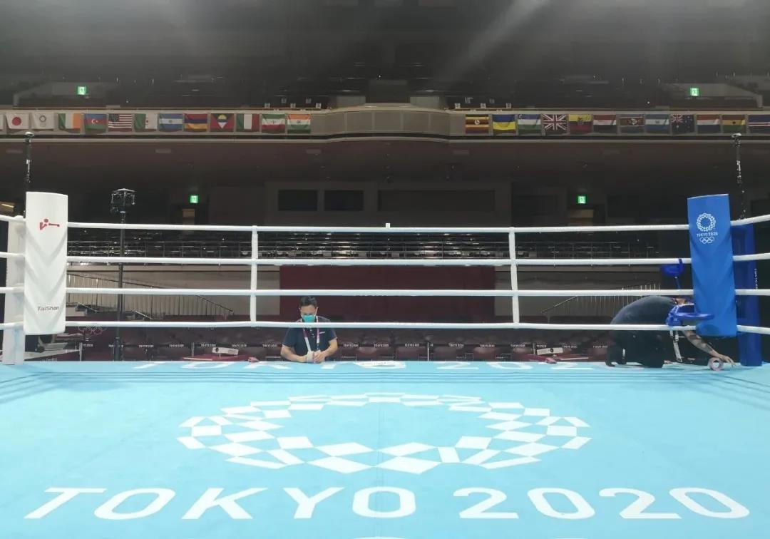2021年7月21日,日本东京国技馆——奥运会拳击比赛馆。开云体育东京奥运会服务保障团队正在检查调试拳击器材。
